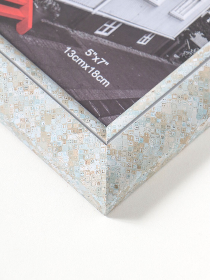 Эта фоторамка для фото 13×18 см станет изящным акцентом в интерьере. Её дизайн вдохновлён искусством марокканской мозаики с тонкой игрой голубых оттенков. Универсальная система крепления даёт свободу выбора: повесить на стену или поставить на стол.