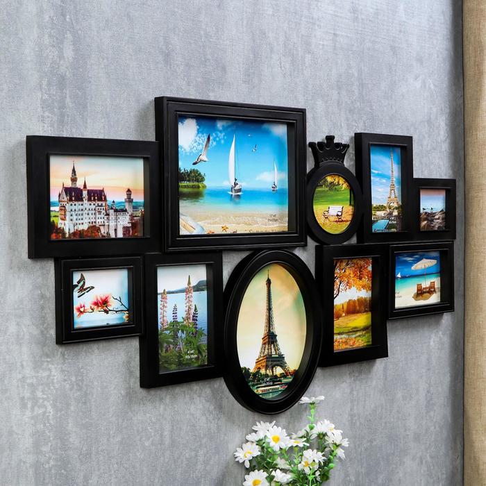 Фоторамка пластик на 10 фото 10х10, 10х15, 13х18, 15х20, 20х25 см "Корона" чёрная 45х80 см