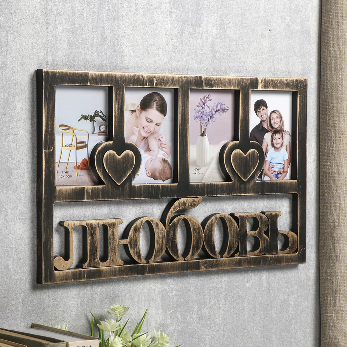 Фоторамка пластик на 4 фото 10х15 см "Любовь - два сердца" тёмное золото 31х48х2 см
