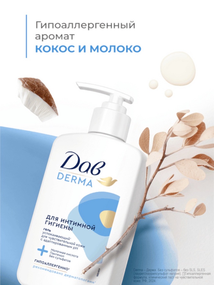 Гель для интимной гигиены Дав Derma – это средство ухода, созданное специально для женщин и девушек. Гипоаллергенная деликатная формула для чувствительной кожи с пантенолом и молочной кислотой поддерживает естественный pH - баланс интимной зоны.