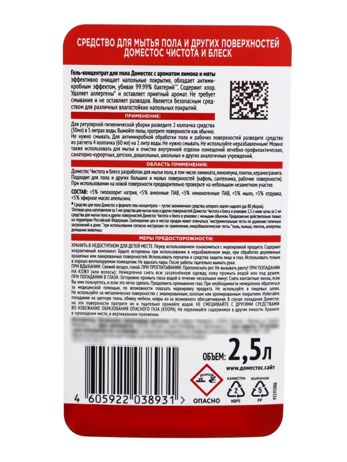 Средство для пола «Доместос» лимон и мята, гель-концентрат, 2.5 л