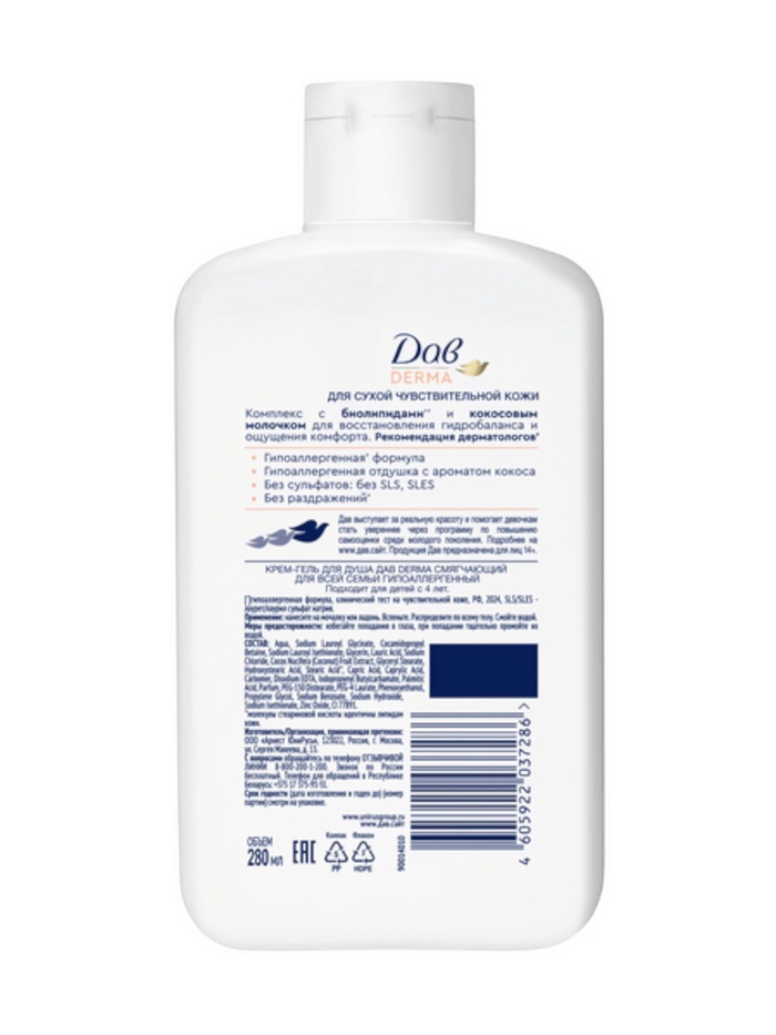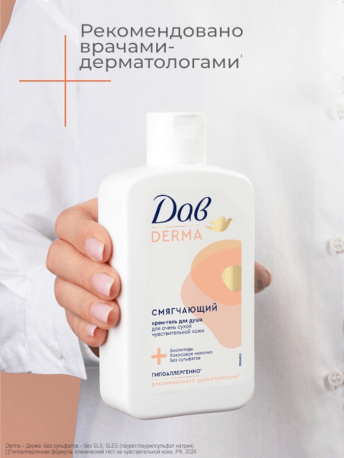Гипоаллергенный смягчающий крем-гель для очень сухой чувствительной кожи Дав Derma – это идеальный выбор для ухода за кожей всей семьи.
