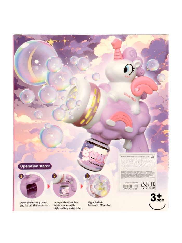 Технические характеристики Генератор мыльных пузырей «Единорог на облачке», световые эффекты, работает от батареек