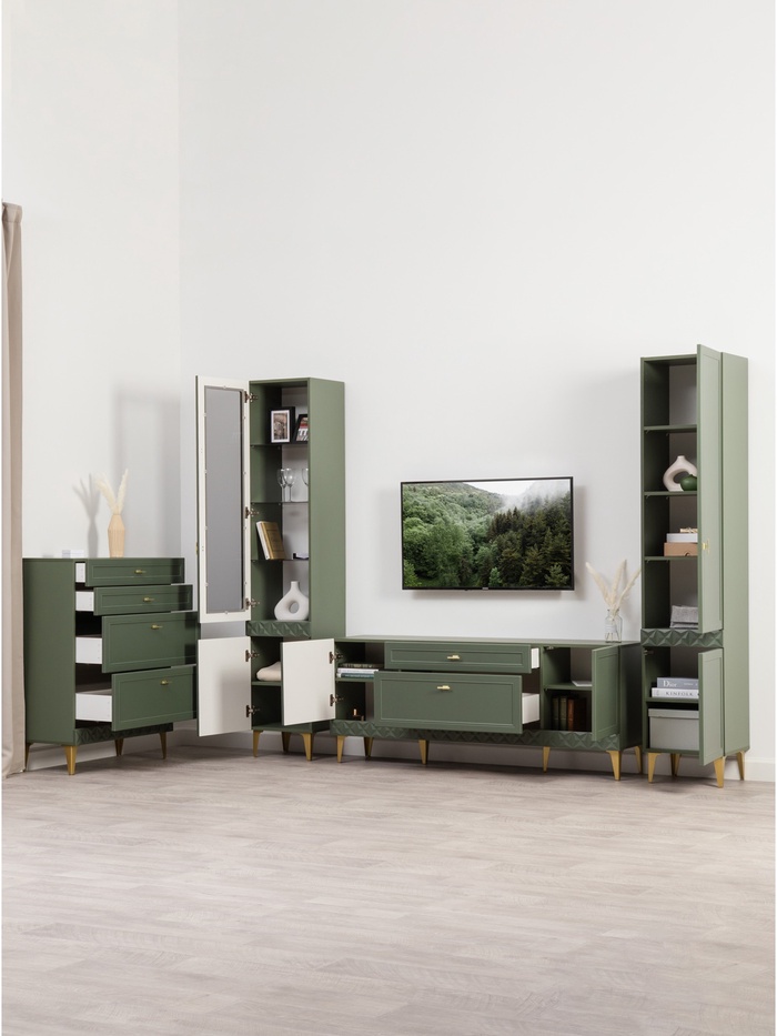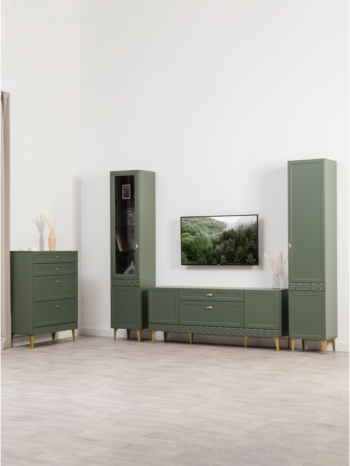 Стильное и продуманное решение для оформления гостиной в классическом стиле. Компоновка в цвете «Олива шагрень» с глубоким зелёным оттенком придаёт интерьеру выразительность, создаёт атмосферу уюта и благородства.
