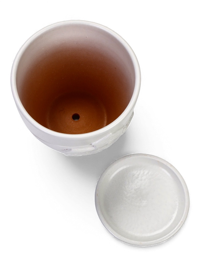 - Узнаваемый дизайн: рельефный узор — характерная деталь этой серии, которая придаёт классическому белому горшку индивидуальность. Встроенный поддон решает практическую задачу и сохраняет чистоту стиля.