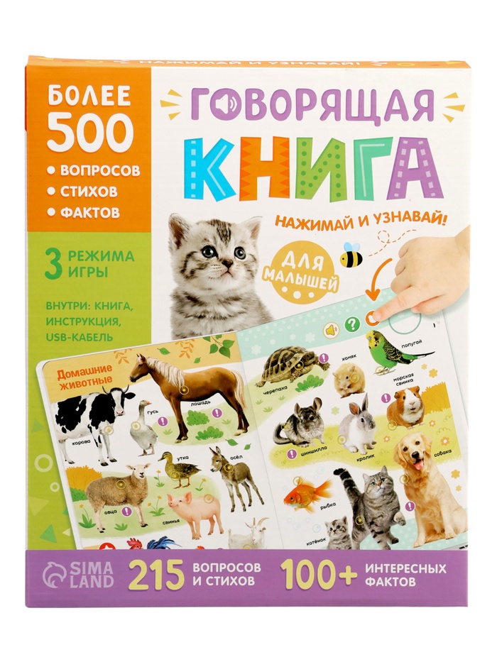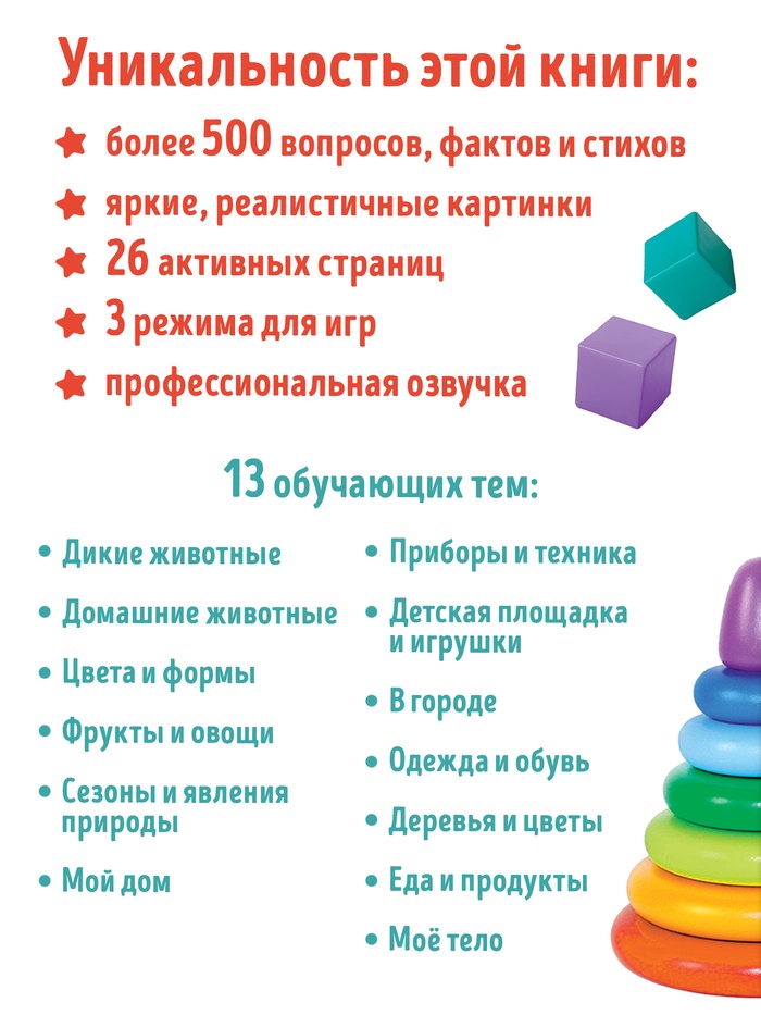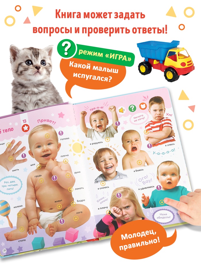 Каждая страница — интерактивное занятие: знакомство с животными, фруктами , временами года. Книга отвечает на вопросы, задаёт свои и хвалит за правильные ответы. Это не просто чтение — это диалог, в котором малыш чувствует себя важным участником.