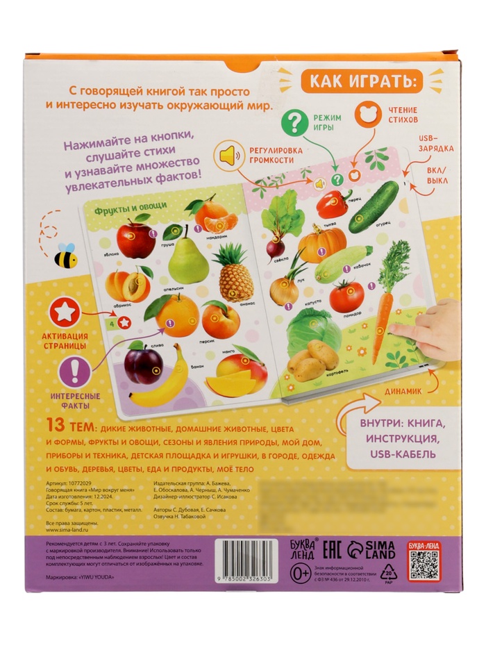 Говорящая книга «Мир вокруг меня» — это первый шаг малыша в большой мир, где всё можно потрогать, услышать и понять. Нажал на картинку — и зазвучал голос: «Это корова! Она говорит „мууу“». Так ребёнок не просто смотрит на животных, транспорт или фрукты — он слышит их, повторяет за ними и учится говорить сам.