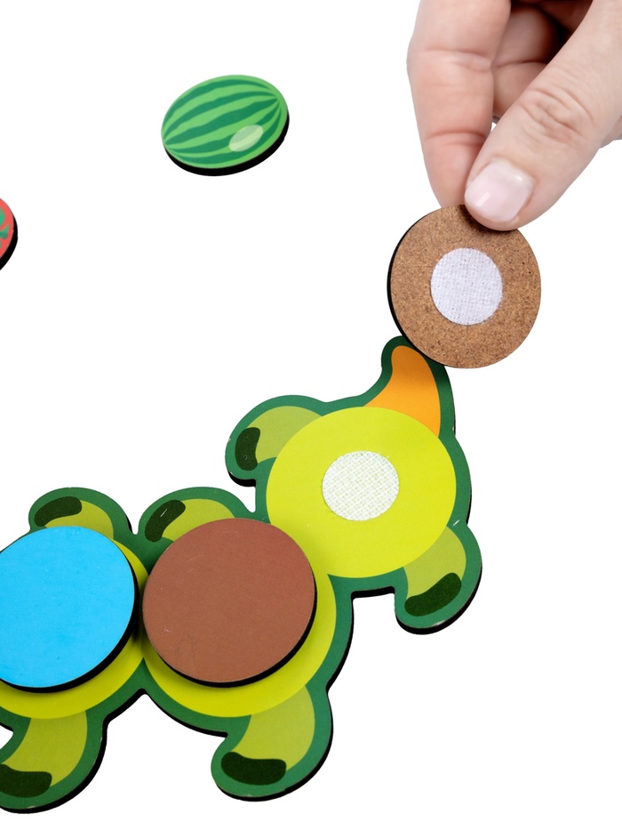 Сначала ребёнок собирает гусеницу из трёх частей, соединяя элементы между собой. Далее выбирайте карточку с заданием и предложите малышу выполнить его - необходимо подобрать подходящие фишки и закрепить их на нужные места с помощью липучек.
