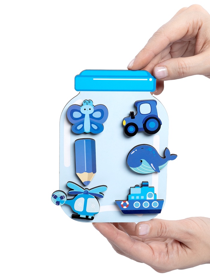 Каждая «баночка» соответствует определённому цвету, а задача ребёнка - правильно распределить элементы. Такой формат помогает легко и быстро запомнить базовые цвета: жёлтый, синий, зелёный, красный и оранжевый.