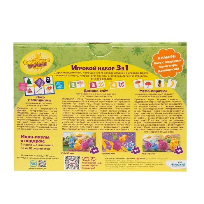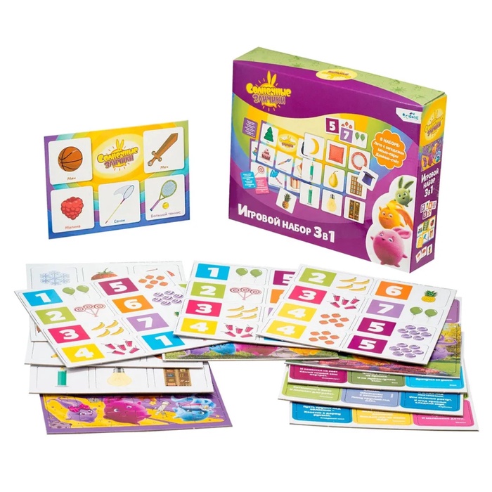 Технические характеристики Игровой набор 3 в 1 «Солнечные зайчики»: лото с загадками, мемо-пары, домино-счет