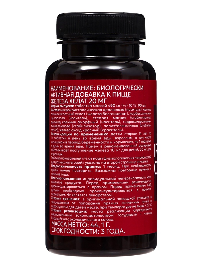 Микрокристаллическая целлюлоза (носитель), железа аминокислотный хелат (железа бисглицинат), карбоксиметилцеллюлоза (носитель), стеарат магния (стабилизатор), диоксид кремния аморфный (носитель), гидроксипропилметилцеллюлоза (стабилизатор), полиэтиленгликоль (стабилизатор), железа оксид красный (краситель).