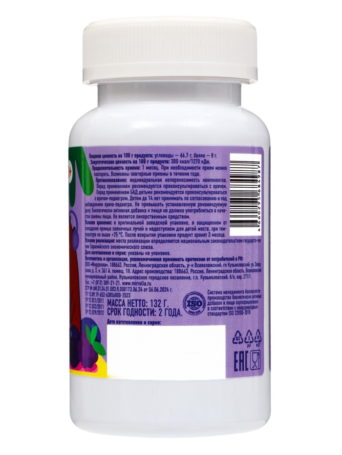 Патока крахмальная, сахар, желатин, вода, магния лактат, глицин, лимонная кислота (регулятор кислотности), экстракт мяты, экстракт мелиссы, ароматизатор натуральный «Ягодный микс», концентрированный сок черной моркови (краситель натуральный), глазирователь (кокосовое и пальмоядровое масла, воск карнаубский), пиридоксина гидрохлорид (Витамин В6), цианокобаламин (Витамин В12).