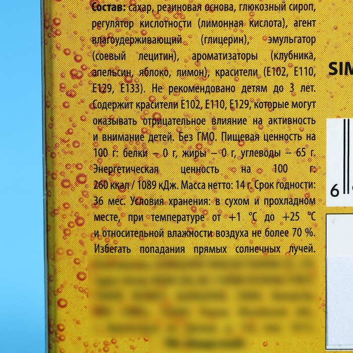 Состав: сахар, резиновая основа, глюкозный сироп, регулятор кислотности (лимонная кислота), агент влагоудерживающий (глицерин), эмульгатор (соевый лецитин), ароматизаторы (клубника, апельсин, яблоко, лимон), красители (Е102, Е110, Е129, Е133). Не рекомендовано детям до 3 лет. Содержит красители Е102, Е110, Е129, которые могут оказывать отрицательное влияние на активность и внимание детей. Без ГМО.