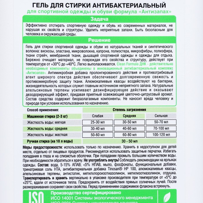 Предназначен для ручной и машинной стирки спортивной одежды и обуви из натуральных тканей и синтетического волокна: вискозы, эластана, микроволокна, капрона, полиэстера, микрофибры, полиэфира, ткани стрейч, мембранной ткани, дышащей спортивной одежды и одежды для отдыха. Бережно очищает материал от загрязнений, не повреждая его свойства и структуру, действует при температуре от +30°С до +40°С. Легко выполаскивается. Инновационные компоненты состава эффективно борются с неприятными запахами и патогенными микроорганизмами. Высокоактивная антимикробная добавка пролонгированного действия и противогрибковый агент широкого спектра действия в составе средства обеспечивают долговременную свежесть и противомикробную защиту ткани. Натуральные апельсиновые терпены усиливают дезинфицирующее действие и дезодорирующий эффект, придавая приятный освежающий аромат. Алюмокалиевые квасцы избирательно воздействуют на бактерии, жизнедеятельность которых служит главным источником неприятного запаха.