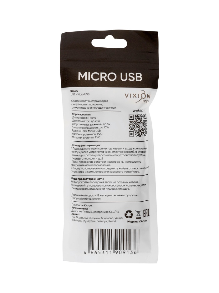 Кабель VIXION PRO VX-17m, USB - micro USB, 2.1 А, 1 м, белый