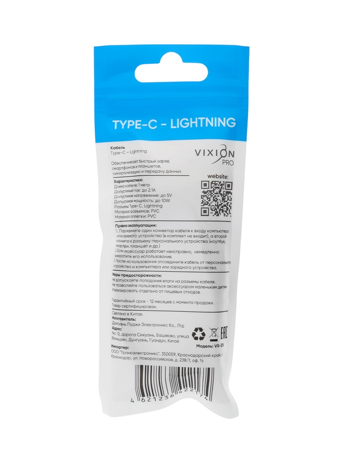 Кабель VIXION PRO VX-27i, Type-C - Lightning, 10 Вт, 1 м, белый