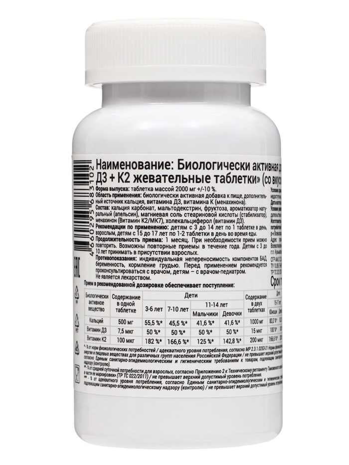 В одной таблетке содержится: Кальция — 500 мг, Витамина Д3 — 7,5 мкг, Витамина K2 — 100 мкг.