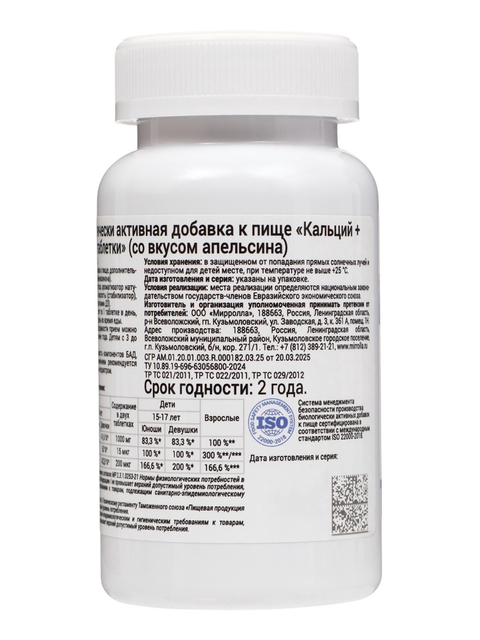 Кальция карбонат, мальтодекстрин, фруктоза, ароматизатор натуральный (апельсин), магниевая соль стеариновой кислоты (стабилизатор), менахинон (Витамин К2/МК7), холекальциферол (витамин Д3).