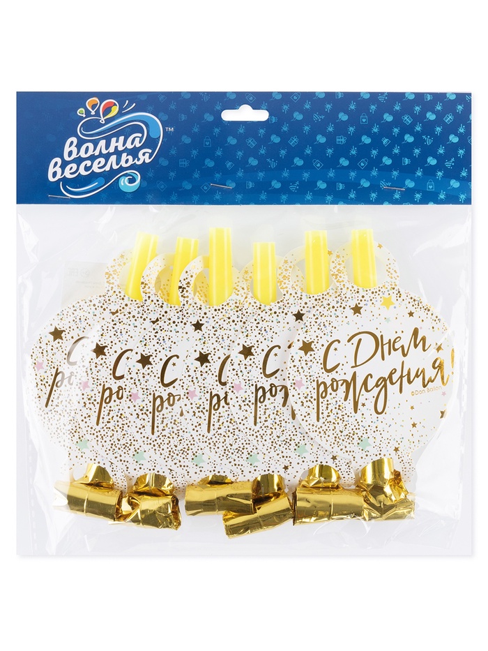 Карнавальные язычки гудки "С Днем Рождения" (сверкающие блестки), 11 см, 6 шт. в упак.