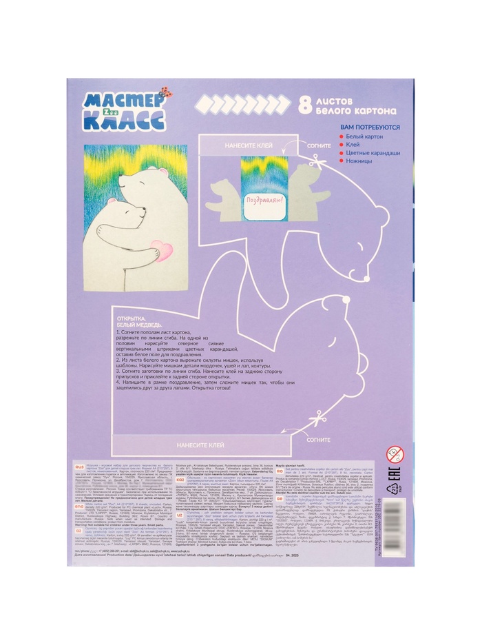 Картон белый «Белый медведь», А4, 8 листов, односторонний, немелованный, плотность 220 г/м²