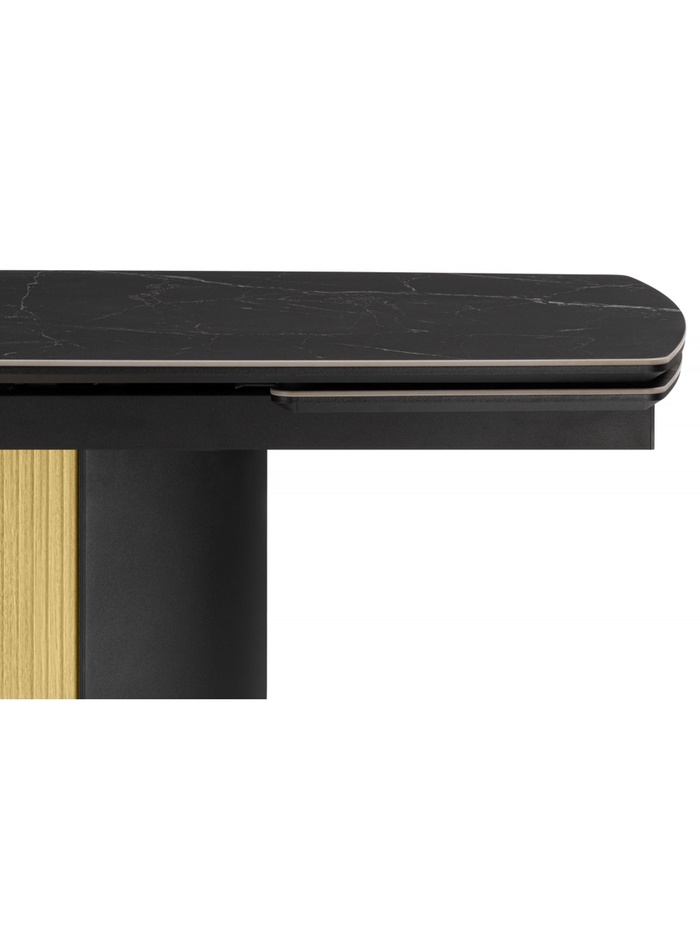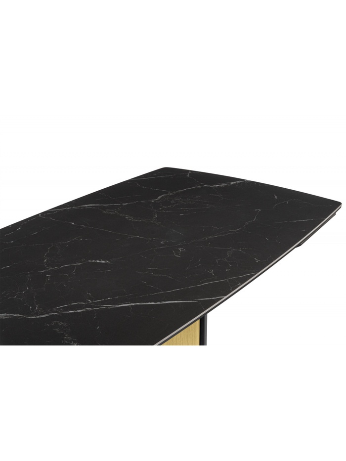 Стол «Бовер» оснащён раздвижным механизмом, который позволяет увеличивать длину столешницы с 180 до 220 см, обеспечивая дополнительное пространство для работы, приёма пищи или размещения гостей. Каркас выполнен из металла, обеспечивая устойчивость и долговечность конструкции. Керамическая столешница с отделкой «черный мрамор» устойчива к царапинам, влаге и высокой температуре, а декоративные элементы из дуба натурального цвета придают столу визуальную выразительность и стиль.