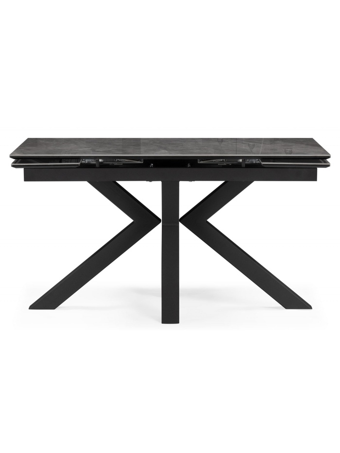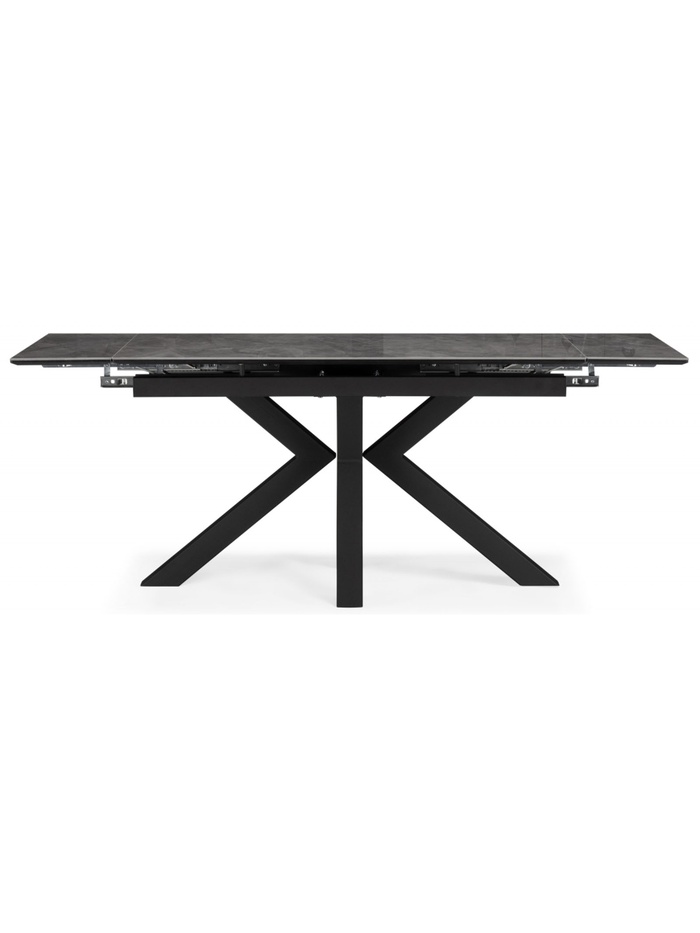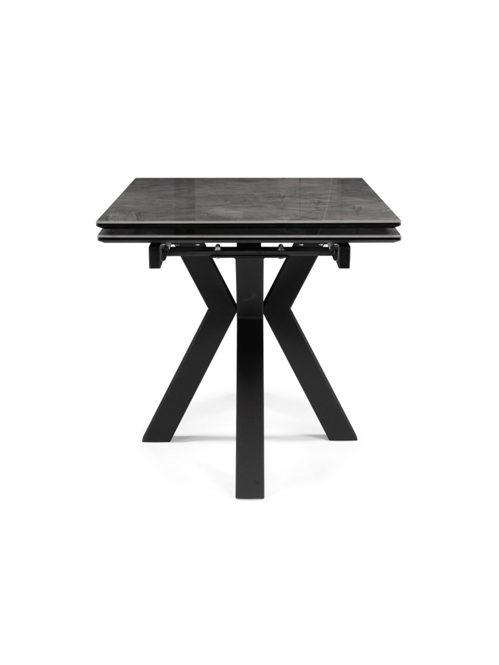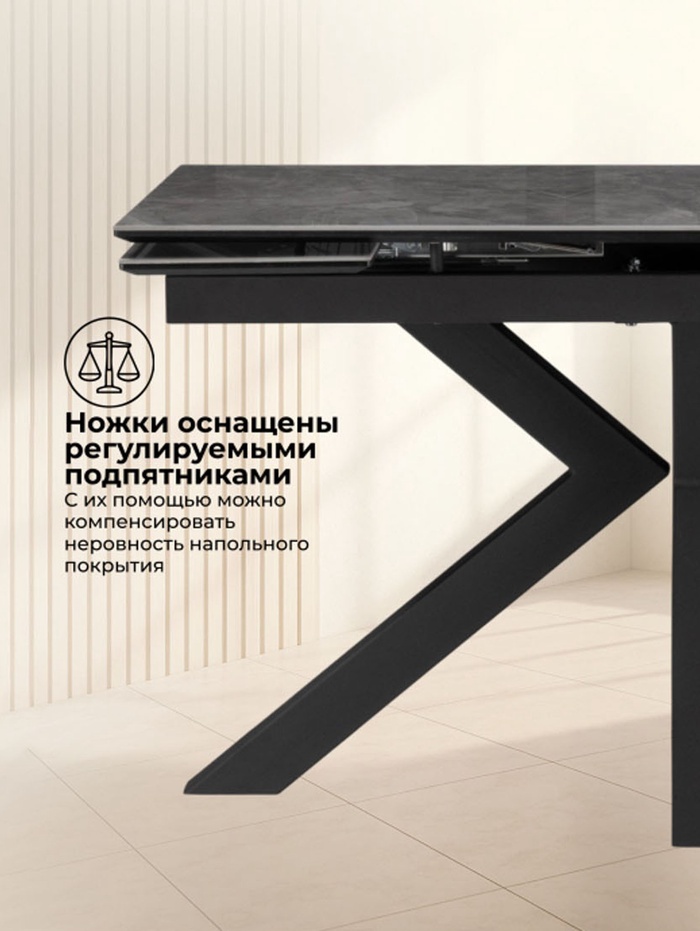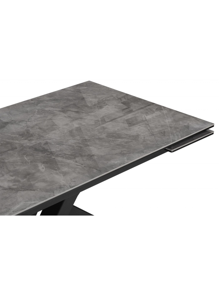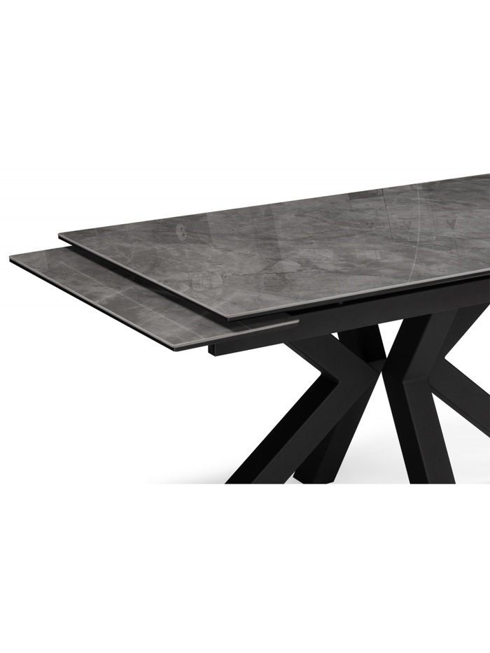 Столешница выполнена из керамики, что обеспечивает высокую прочность, устойчивость к царапинам, влаге и перепадам температуры. Металлический каркас с черным покрытием гарантирует надежность и долговечность конструкции. Раздвижной механизм позволяет увеличивать длину стола с 140 до 200 см, предоставляя дополнительное место для гостей.