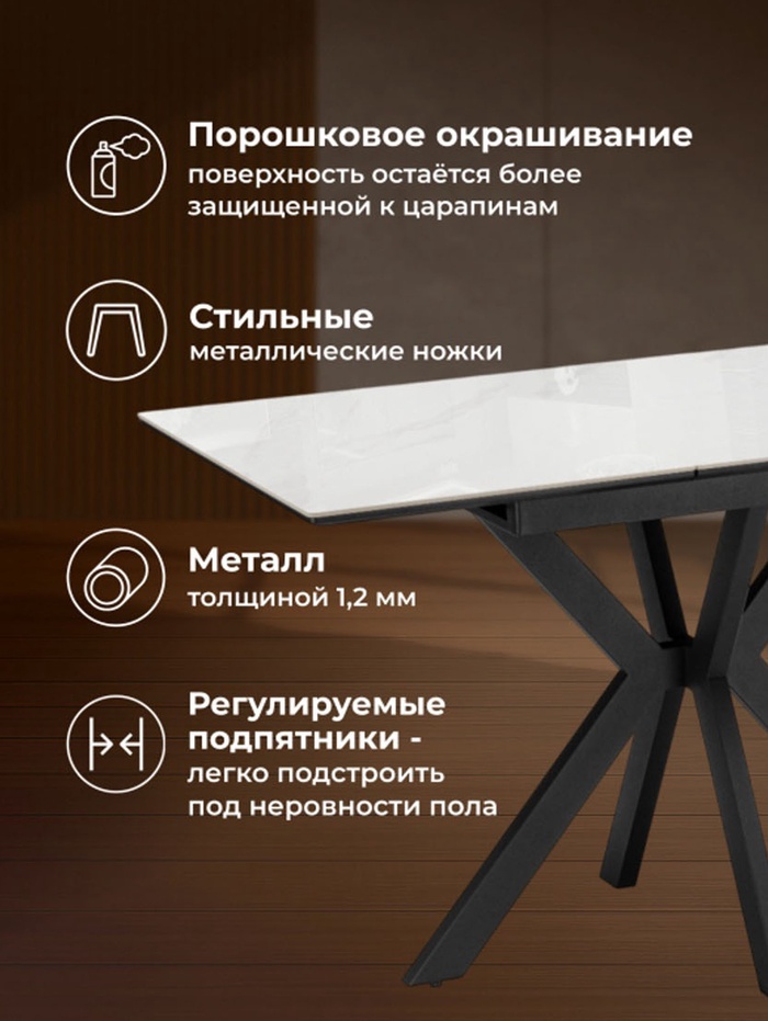 - Стильный акцент: керамическая столешница и элегантный дизайн делают стол самостоятельным декоративным элементом интерьера.