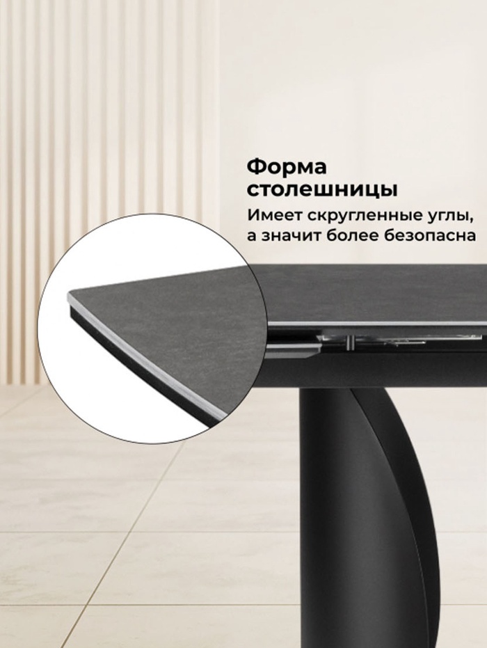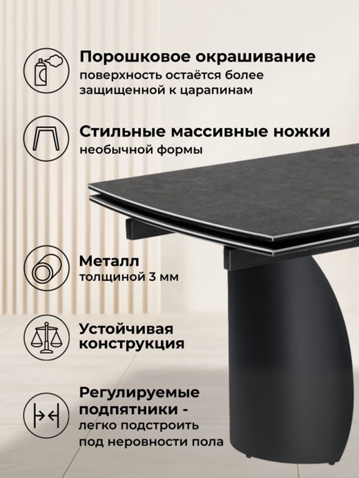 Элегантный керамический стол «Готланд» с графитовой столешницей (ink gray) и черным металлическим каркасом объединяет современный дизайн и высокую функциональность. Модель отлично подходит для кухни или столовой, создавая удобное пространство для обедов, работы или встреч с друзьями.