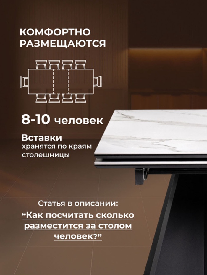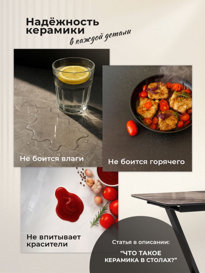 Металлический каркас гарантирует устойчивость и долговечность, а столешница из керамики толщиной 2 см устойчива к нагрузкам и легко очищается. Расстояние между ножками 60 см обеспечивает комфорт для размещения стульев и свободное пространство для ног.