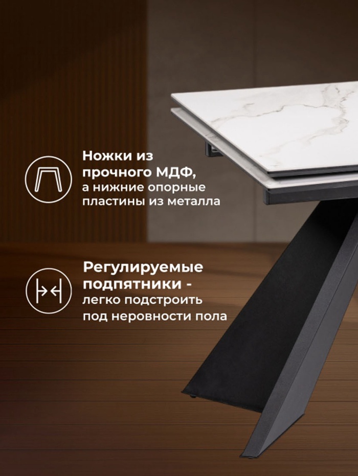 Элегантный керамический стол «Ливи» сочетает стильный дизайн и практичность. Белая мраморная столешница в сочетании с черным металлическим каркасом создаёт современный и лаконичный образ, подходящий для кухни, столовой или гостиной. Стол оснащён раздвижным механизмом: длина изменяется с 140 до 200 см, обеспечивая дополнительное пространство при необходимости.