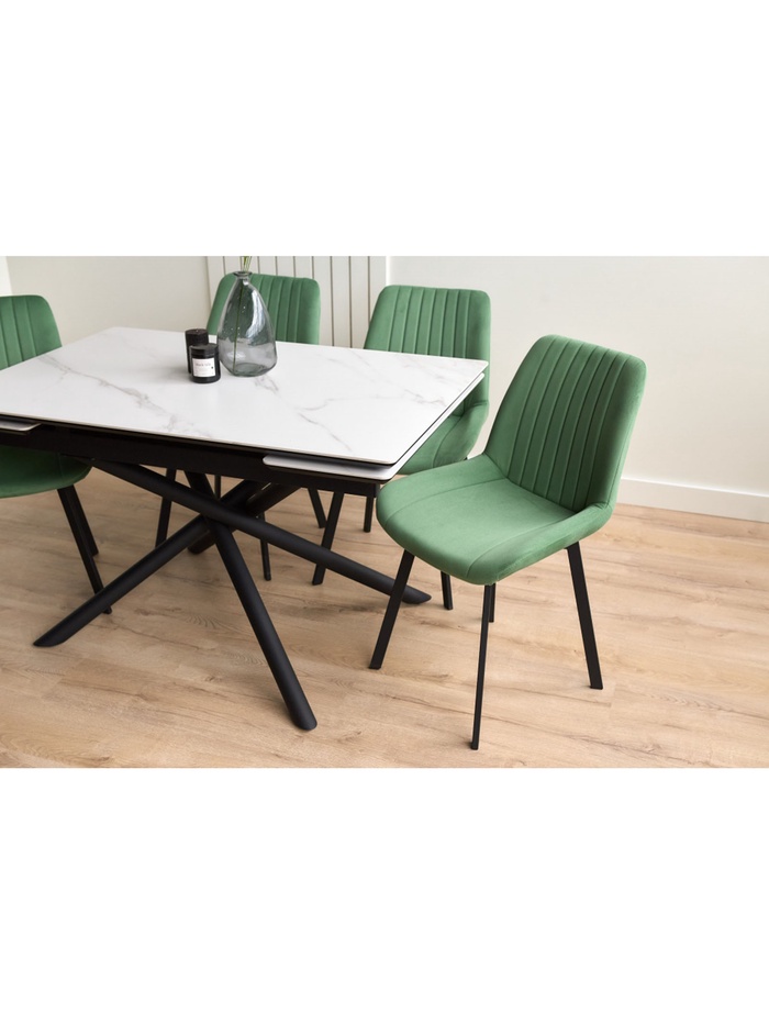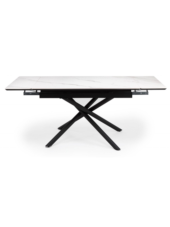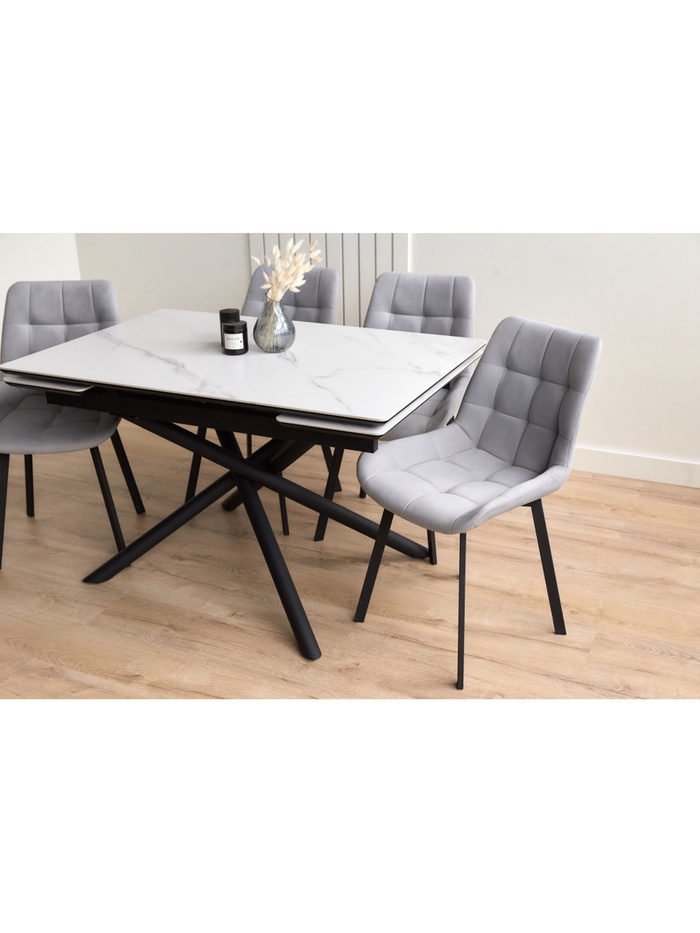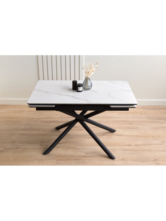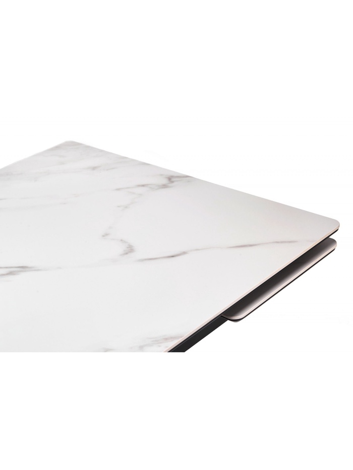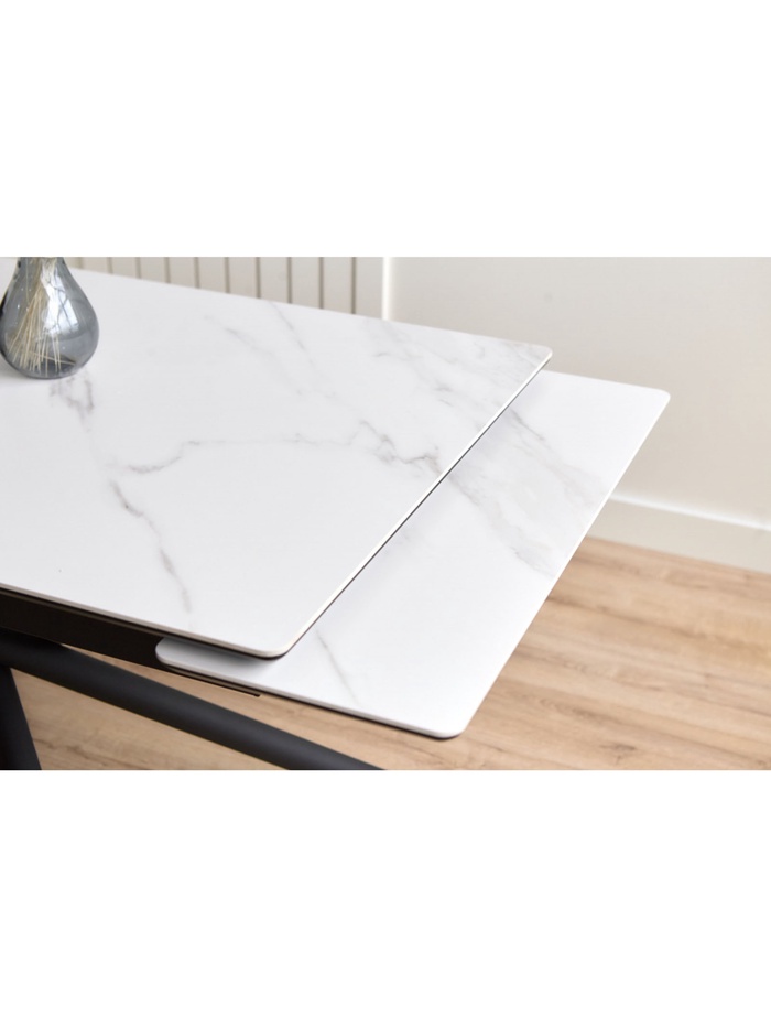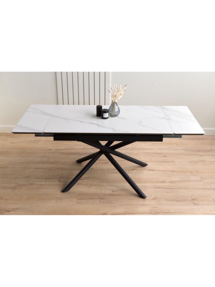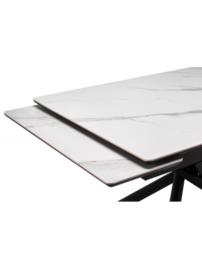 Раздвижной механизм позволяет увеличить длину стола с 120 до 180 см, обеспечивая дополнительное пространство для комфортного размещения гостей. Керамическая поверхность устойчива к царапинам, влаге и перепадам температуры, что делает стол удобным для ежедневного использования.