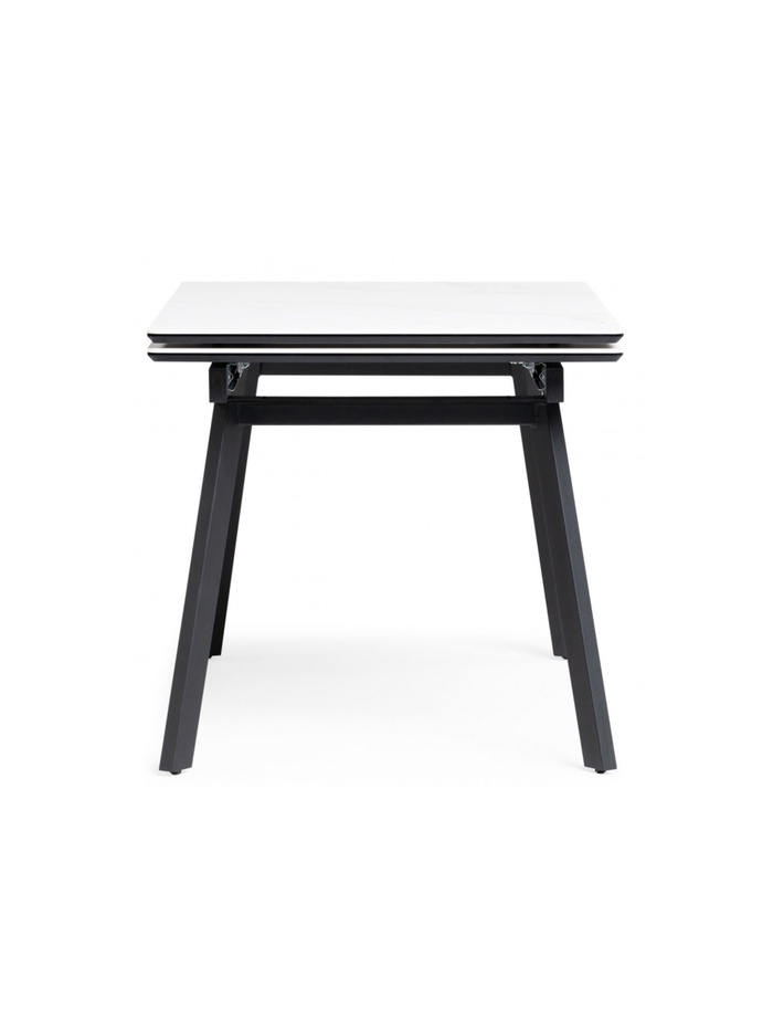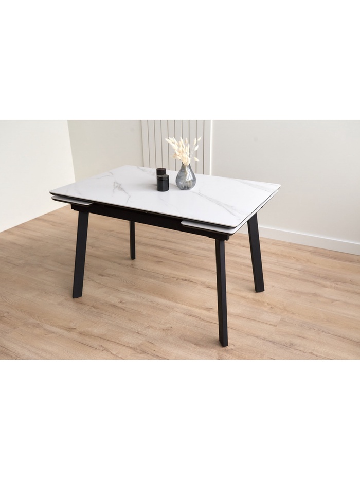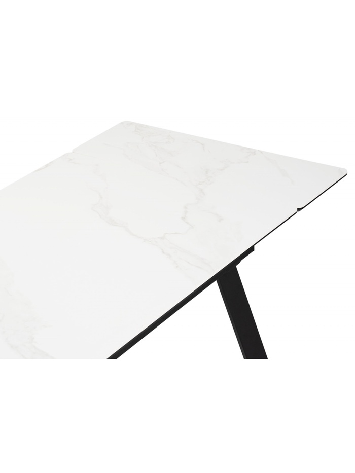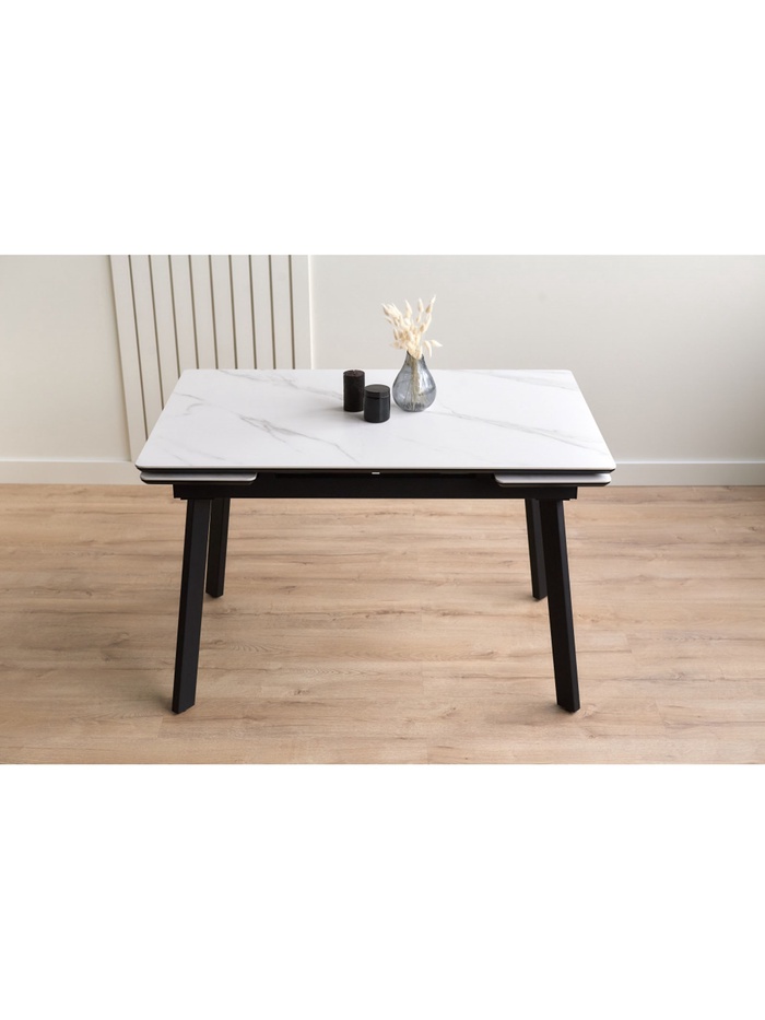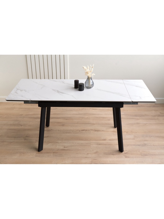 Стол «Норман» оснащён раздвижным механизмом, который позволяет увеличить длину столешницы с 120 до 180 см, обеспечивая дополнительное пространство для комфортного размещения гостей или работы. Металлический каркас гарантирует устойчивость и надёжность конструкции, а керамическая столешница с отделкой snow (alpin) white устойчива к влаге, царапинам и температурным воздействиям, облегчая уход и продлевая срок службы стола. Черные ножки создают контраст и подчёркивают современный дизайн.