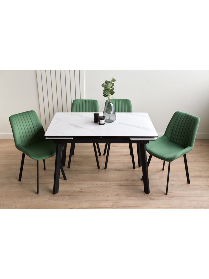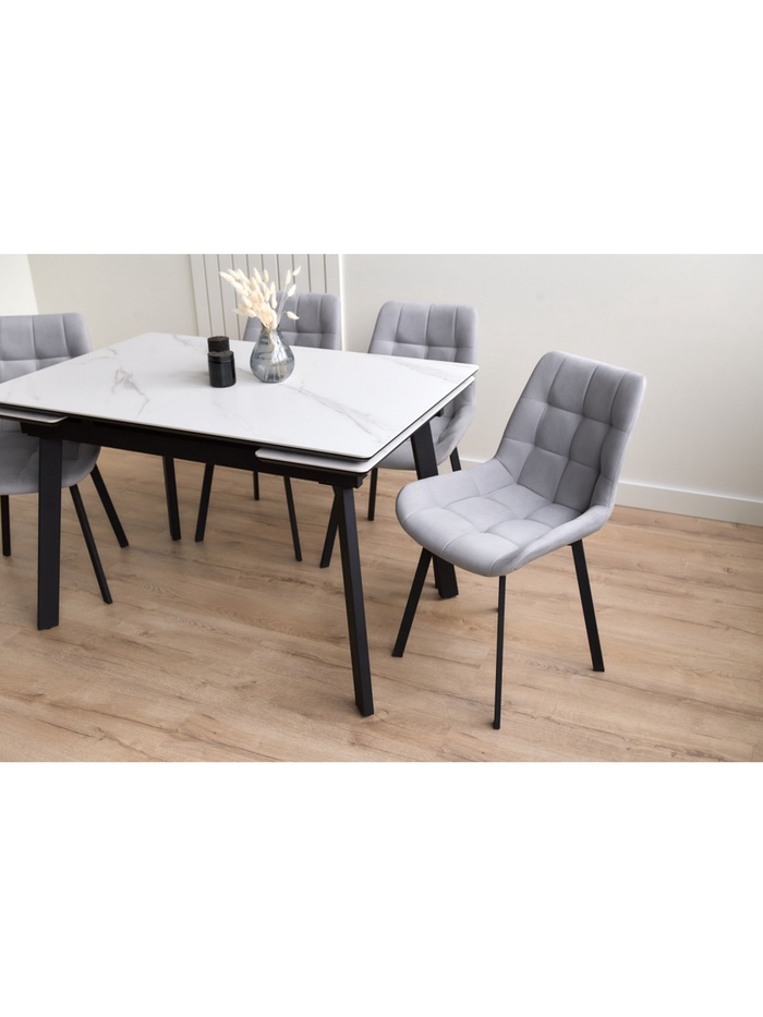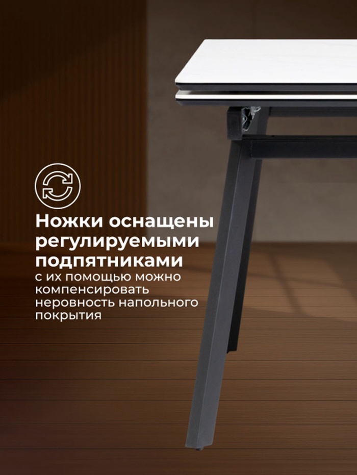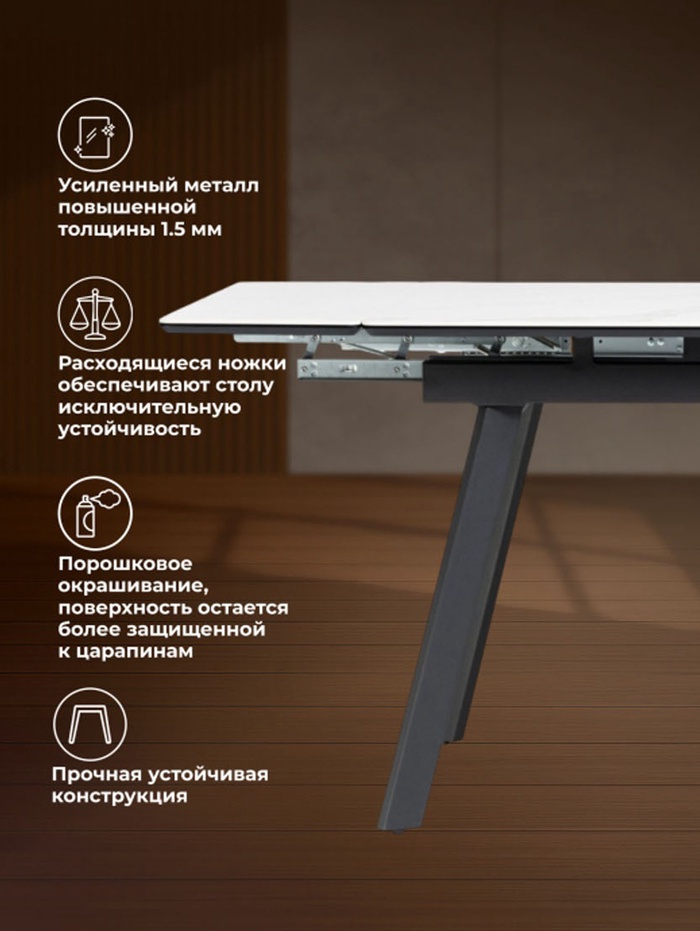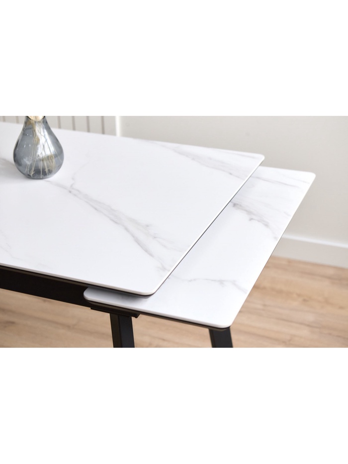 Стол «Норман» оснащён раздвижным механизмом, который позволяет увеличить длину столешницы с 120 до 180 см, обеспечивая дополнительное пространство для комфортного размещения гостей или работы. Металлический каркас гарантирует устойчивость и надёжность конструкции, а керамическая столешница с отделкой snow (alpin) white устойчива к влаге, царапинам и температурным воздействиям, облегчая уход и продлевая срок службы стола. Черные ножки создают контраст и подчёркивают современный дизайн.