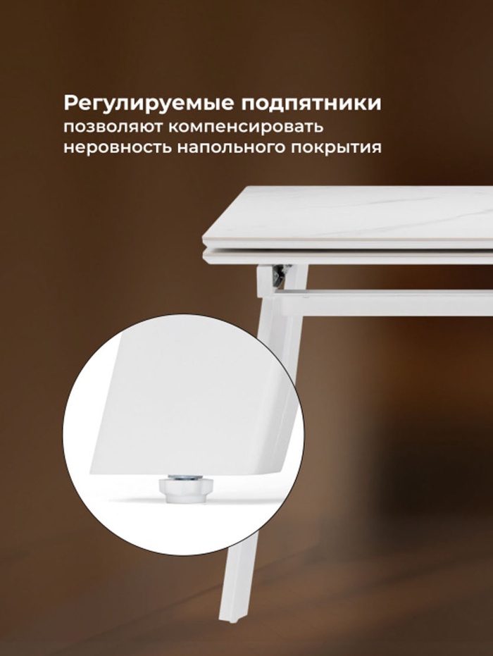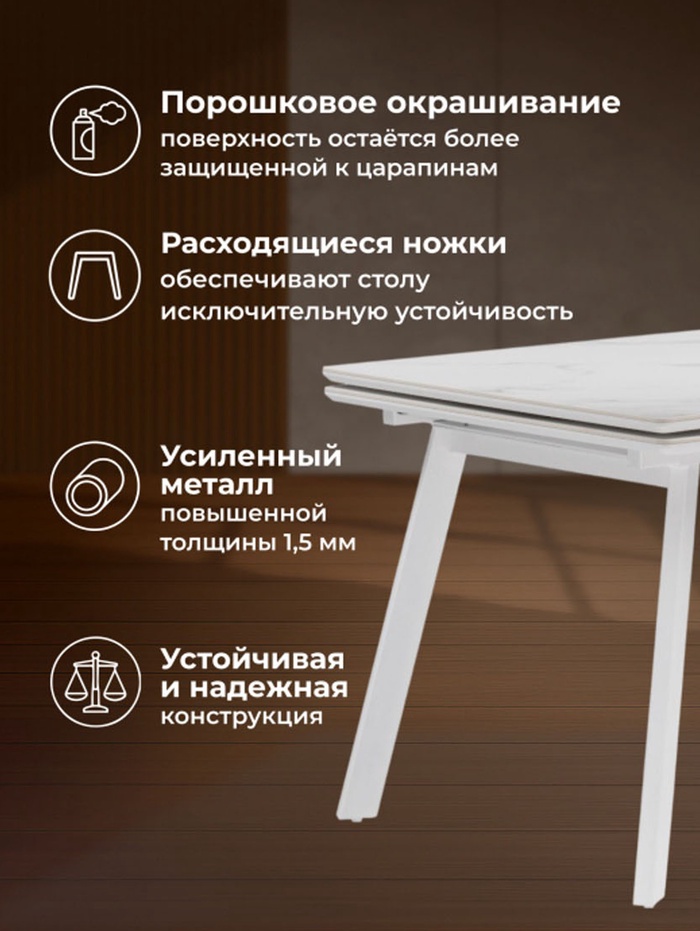 Металлический каркас с белыми ножками гарантирует устойчивость и долговечность конструкции, а керамическая столешница устойчива к царапинам, высокой температуре и легко очищается, что делает стол практичным и надёжным для ежедневного использования.