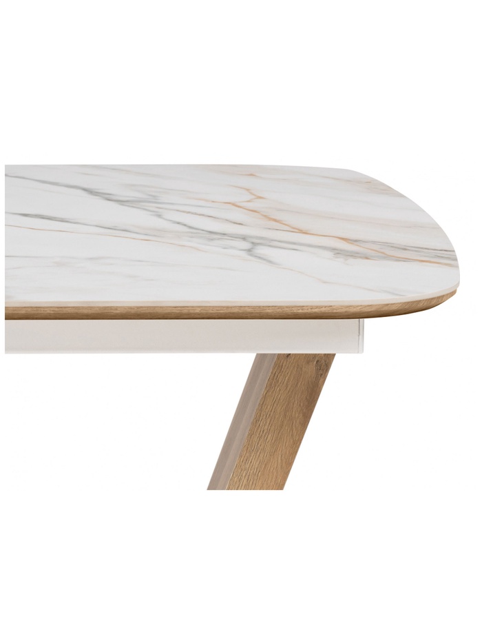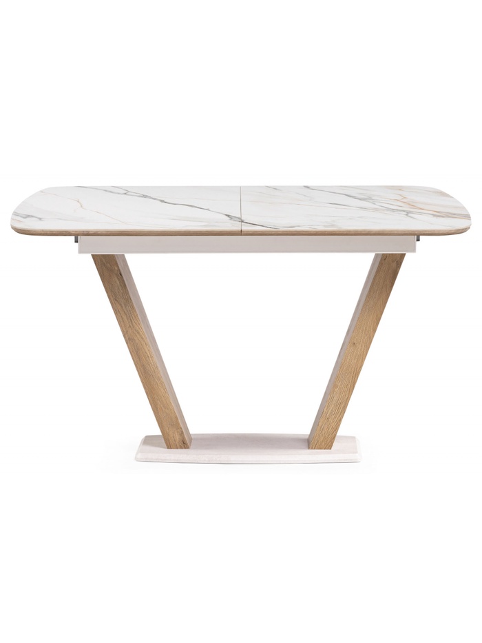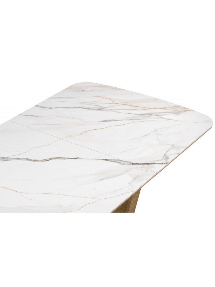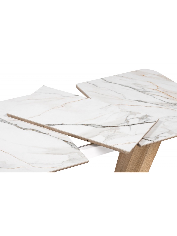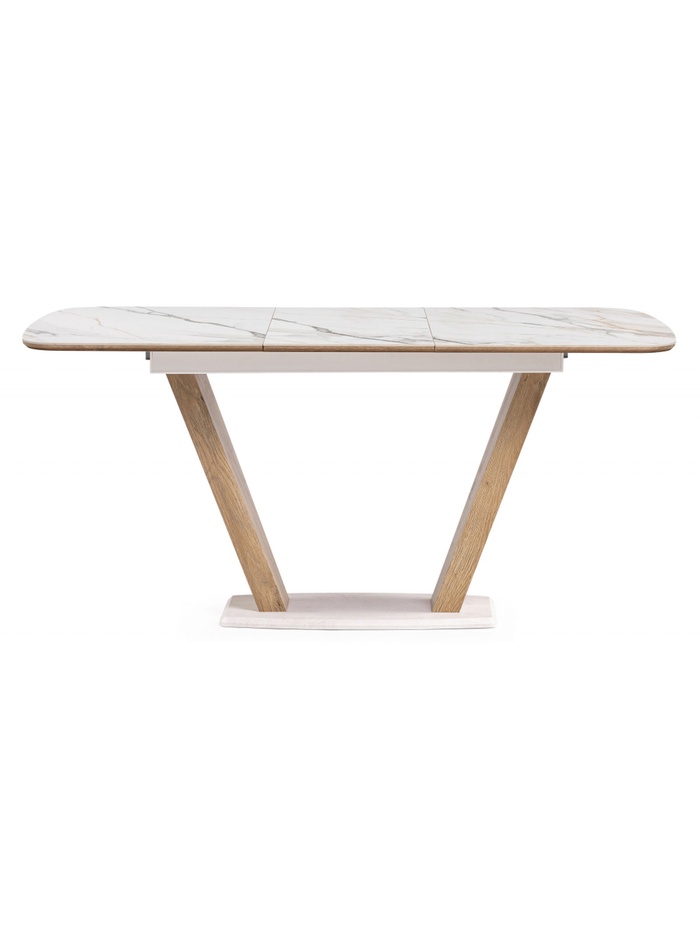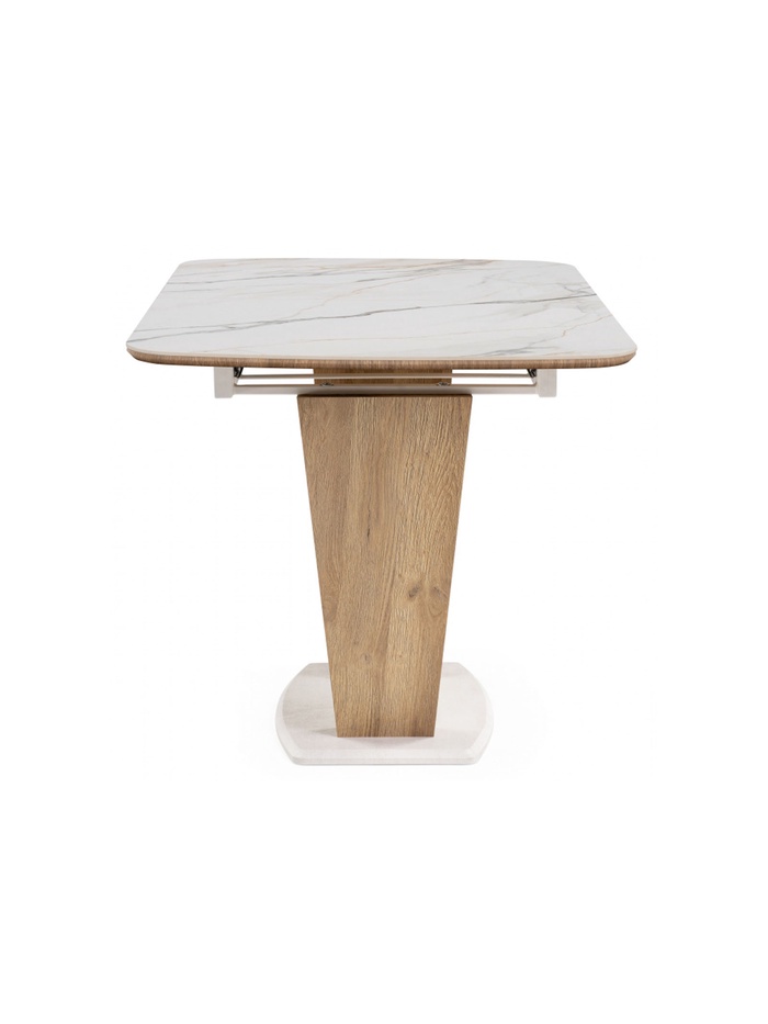 Столешница выполнена из керамики, что обеспечивает высокую прочность, устойчивость к царапинам, влаге и температурным перепадам. Раздвижной механизм позволяет увеличивать длину стола с 120 до 160 см, обеспечивая дополнительное место для гостей при необходимости. Натуральный оттенок ножек дуб монтана гармонично сочетается с белой поверхностью, создавая современный и уютный интерьер.