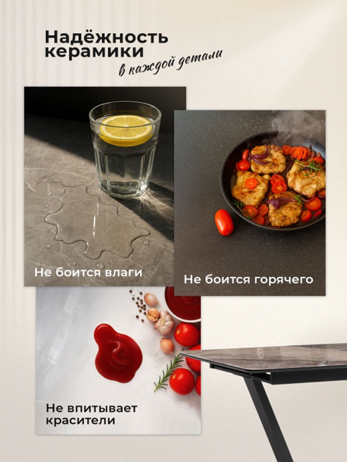 Стол «Симмонс» оборудован раздвижным механизмом, позволяющим увеличивать длину столешницы с 180 до 260 см, что обеспечивает удобное пространство для большой компании или работы. Металлический каркас гарантирует устойчивость и надежность конструкции, а керамическая столешница с отделкой shakespeare black устойчива к влаге, царапинам и высокой температуре, облегчая уход и продлевая срок службы стола.