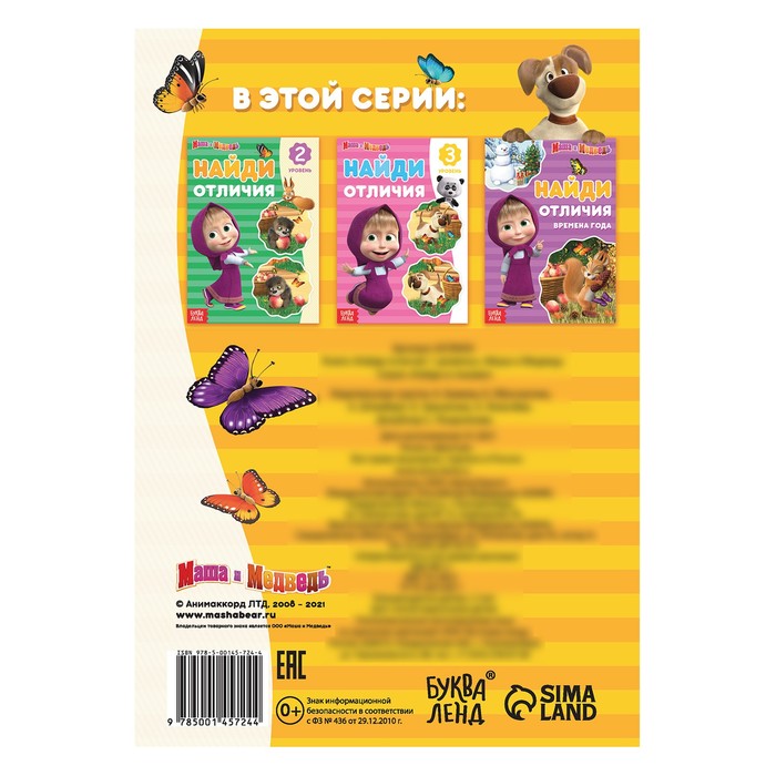Технические характеристики Книга «Найди отличия. 1 уровень», А5, 12 стр., Маша и Медведь