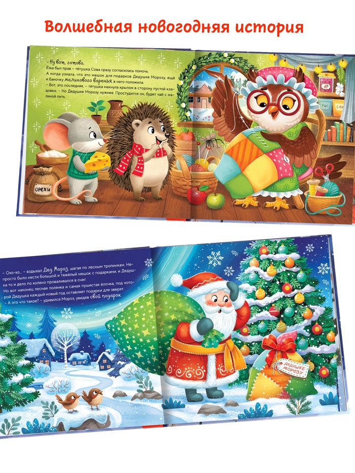 - Яркие иллюстрации создают атмосферу новогоднего волшебства и радости, погружая ребёнка в сказочный мир.