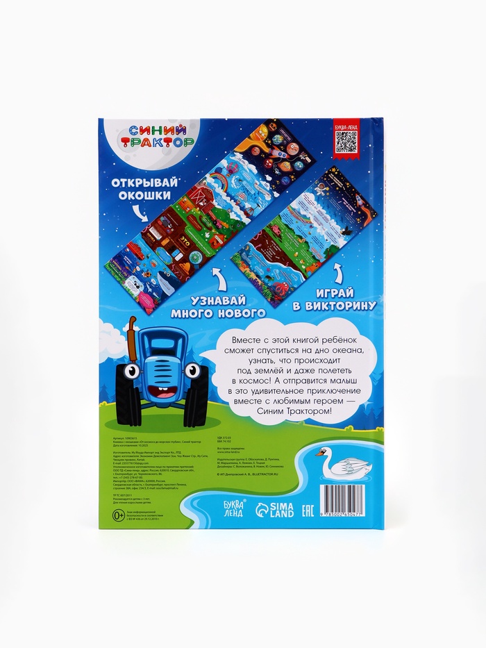 Синий Трактор приглашает малыша в захватывающее путешествие: от далёких галактик и звёздных туманностей до таинственных морских глубин, где плавают киты и светятся медузы. На каждой странице — новые открытия, а 43 подвижных окошка превращают чтение в интерактивную игру. Ребёнок не просто слушает — он сам открывает, исследует и удивляется.