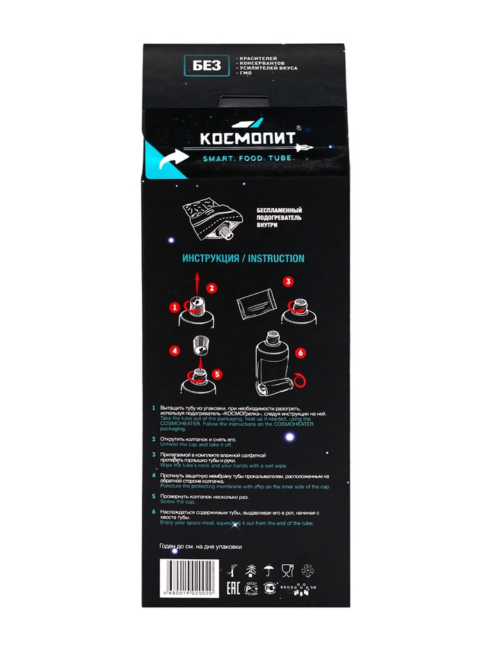 Сытные и вкусные блюда в проверенной тяжёлыми условиями космоса упаковке станут отличной альтернативой сухпайку во время выхода на природу, на охоте или рыбалке. Недостаток места, отсутствие костра и даже экстремальная погода больше не помешают обеду. Вам нужно будет просто разогреть тюбик на портативном нагревателе из комплекта и насладиться вкусной пищей.