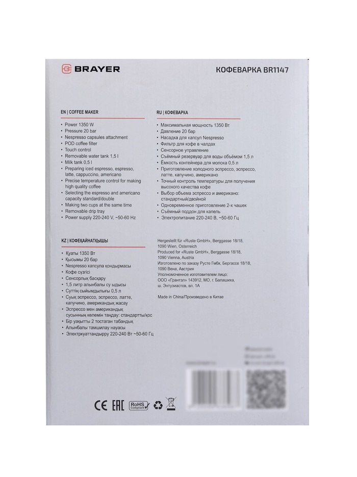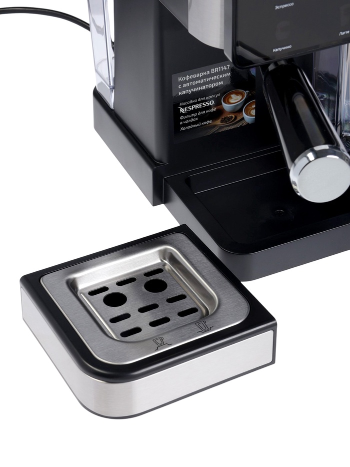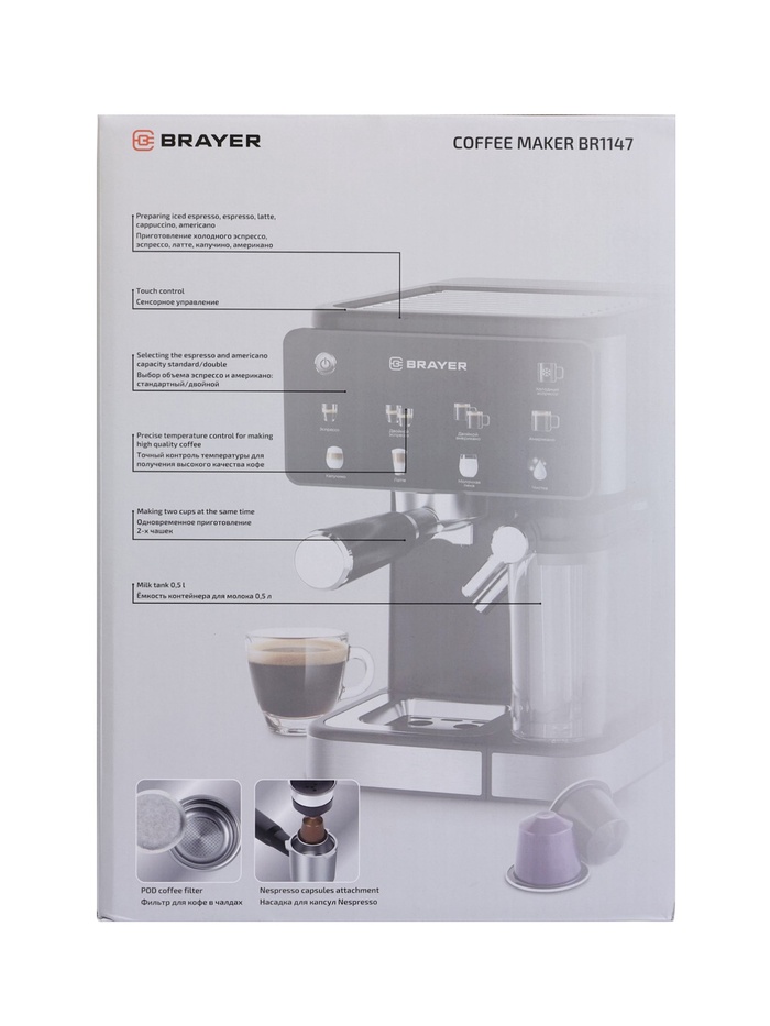 Технические характеристики Кофеварка BRAYER 1147BR, рожковая/капсульная, 1350 Вт, 20 бар, 1.5 л, 0.5 л для молока