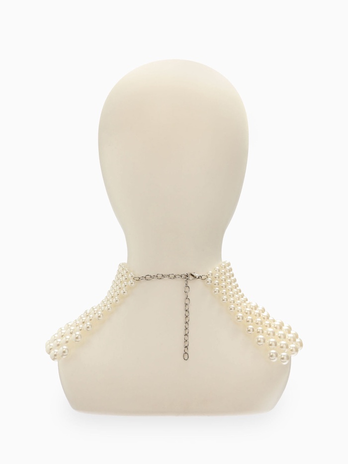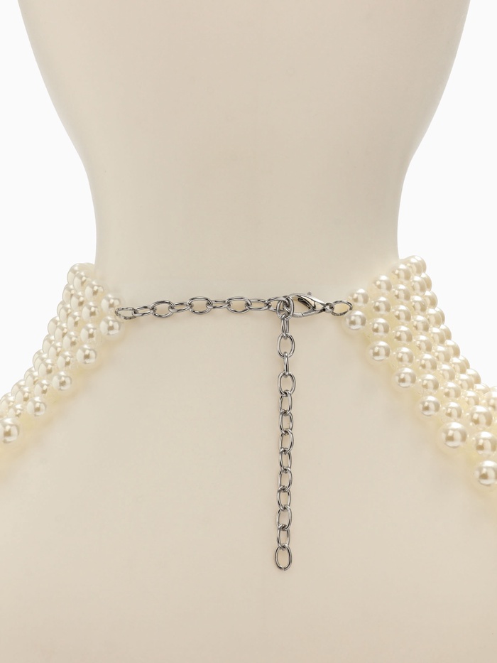 Колье создано из мелких и средних жемчужин, расположенных на красивой пластиковой основе, покрытой серебром. Размер каждой жемчужины варьируется от 8 до 12 миллиметров, что придает украшению дополнительное богатство и разнообразит игру света. Совокупная длина изделия равна 28 сантиметрам, создавая близкое к шее расположение, подчеркивающее линию подбородка и утонченность шеи.