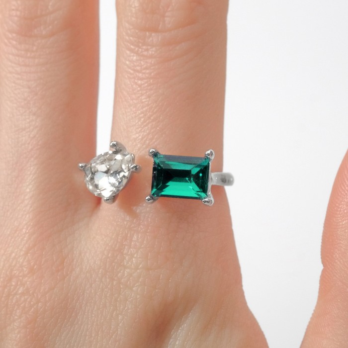 Технические характеристики Кольцо с камнями «Фигуры», безразмерное, цвет бело-изумрудный в серебре