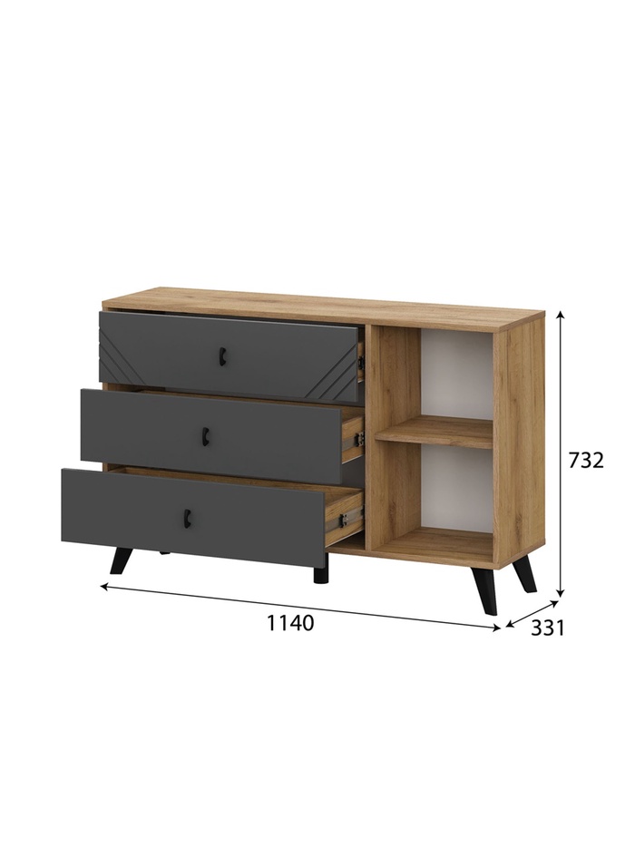 Технические характеристики Комод для хранения «Байкал», 3 ящика, 1 дверь, 1140×331×732 мм, цвет дуб золотой/графит