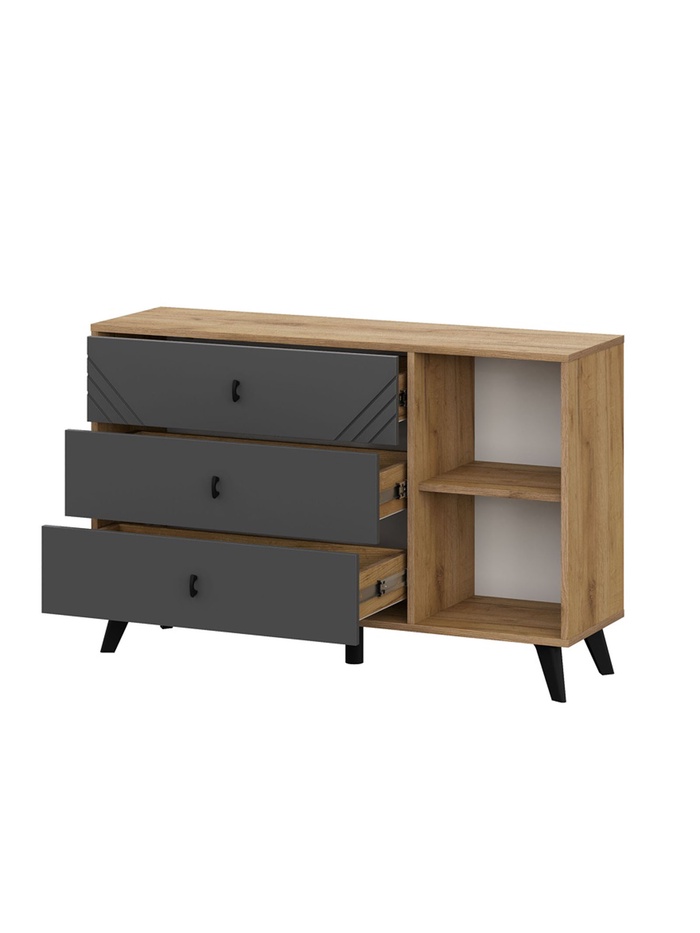 Просторный и стильный комод с комбинированной системой хранения для спальни, гостиной или прихожей. Модель выполнена в выразительном сочетании оттенков: тёплая текстура золотого дуба и глубокий графит создают элегантный контраст, придающий мебели современный характер. Декоративная фрезеровка на фасадах добавляет изысканности и визуального интереса.