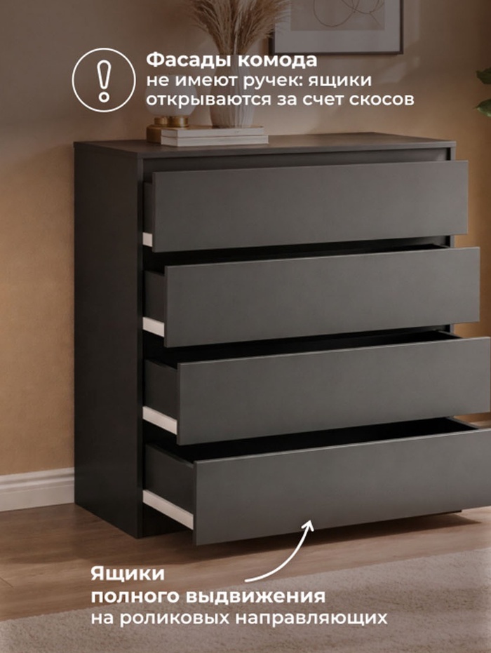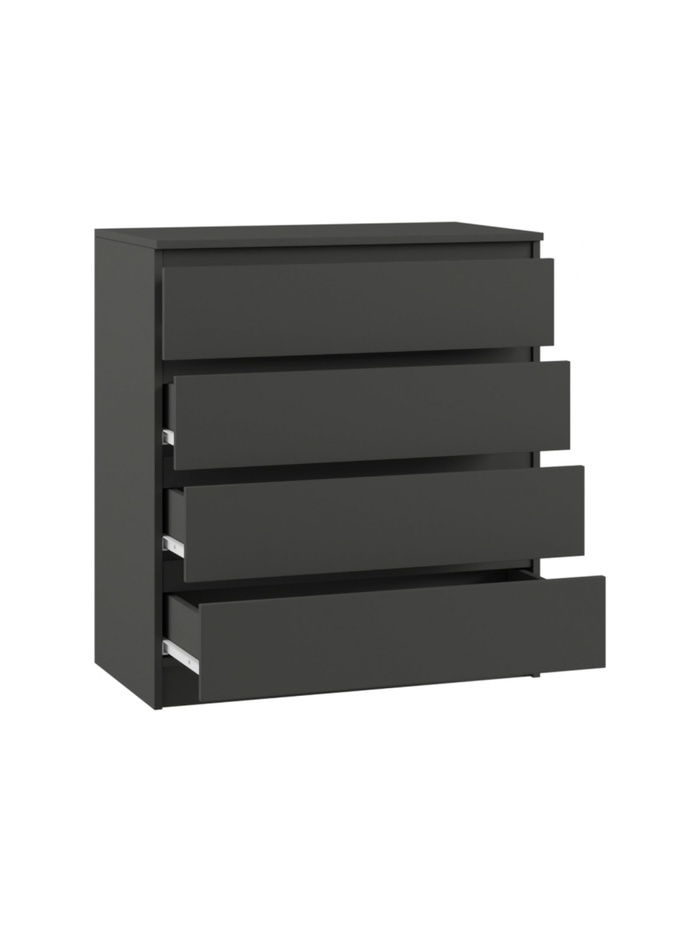 Современный комод «Мадера К4М» в графитовом цвете сочетает стильный дизайн и практичность. Модель оснащена четырьмя вместительными ящиками, которые позволяют удобно хранить одежду, бельё, документы или аксессуары, поддерживая порядок в интерьере.