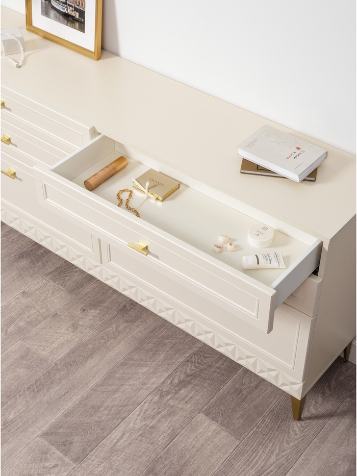 Комод «Марион» — изящное и практичное решение для спальни, которое помогает организовать хранение одежды, белья и повседневных вещей. Модель гармонично сочетает классический дизайн и функциональность, создавая атмосферу уюта и порядка.