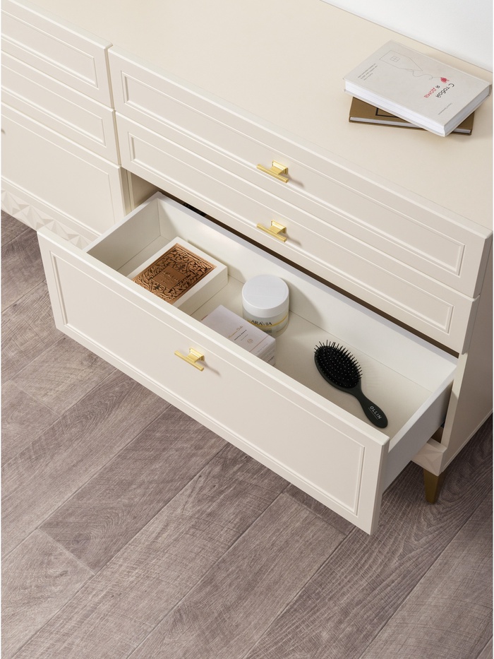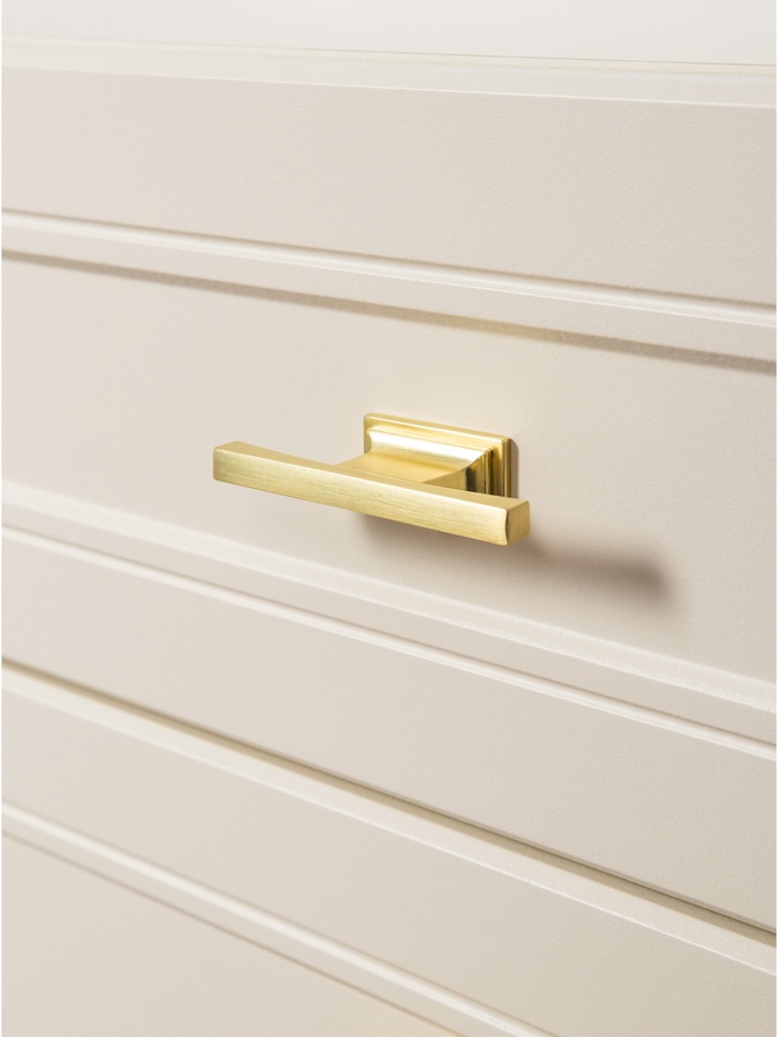 Металлические ручки и опоры золотого цвета добавляют мебели благородный акцент, а фурнитура с доводчиками обеспечивает плавное и бесшумное закрытие ящиков и дверей.