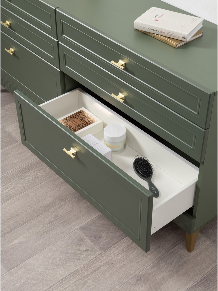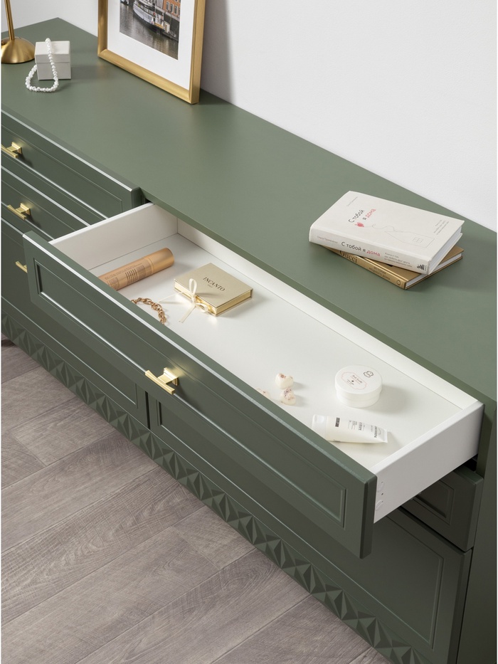 Фасады с глубокой фрезеровкой из МДФ подчёркивают классический стиль, а благородный оттенок «Олива шагрень» с насыщенным зелёным тоном в сочетании с дымчато-зелёным корпусом придаёт мебели глубину и характер. Светлые элементы корпуса создают гармоничный контраст и делают конструкцию визуально легче.