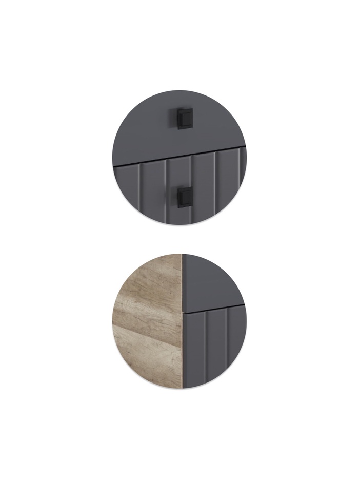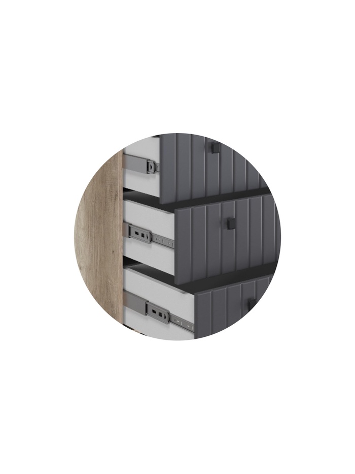 Комод Пласидо сочетает современный стиль и практичность, обеспечивая удобное хранение вещей в спальне, гостиной или прихожей. Элегантное сочетание оттенков дуб каньон монумент и софт серый дым делает мебель универсальной для разных интерьеров.